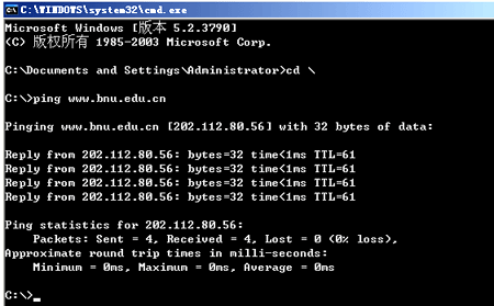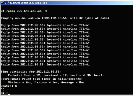 使用tracert命令确定数据包在网络上的断点,即可以判断出现问题的环节。在上述例子中如显示“Trace complete.”,表明从本机到达www.bnu.edu.cn的网络通畅。