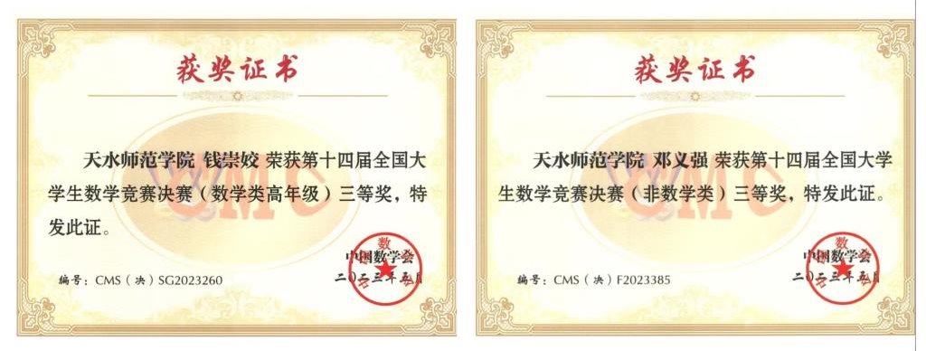 第十四届全国大学生数学竞赛全国32个赛区共231769人报名参加初赛,922人进入决赛,实际参赛人数905人,其中数学专业组461人,非数学专业组444人。决赛分数学类高年级组、数学类低年级组和非数学类三个组别。我校数学与应用数学专业2019级钱崇娇获得数学类(高年级组)三等奖,2021级智能制造工程专业邓义强获得非数学类三等奖,这是我校学生首次获得非数学类决赛奖项。