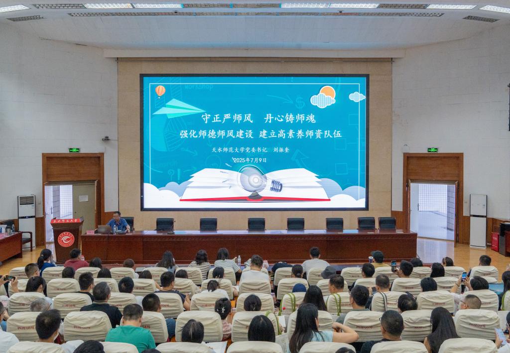 7月9日上午,2025年全省高校教师岗前培训天水师范大学教学班开班仪式在我校2号报告厅举办。校党委书记刘振奎为全体参训教师作题为《强化师德师风建设,建立高素养师资队伍》的专题报告。